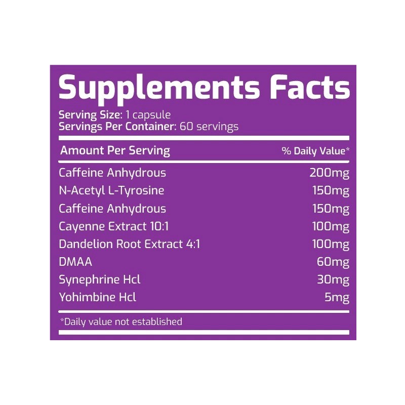 - 1,3-Dimethylamylamine (DMAA) – 60 mg: A potent stimulant renowned for delivering intense energy, heightened focus, and significant thermogenic effects, playing a key role in fat oxidation and elevating workout performance.