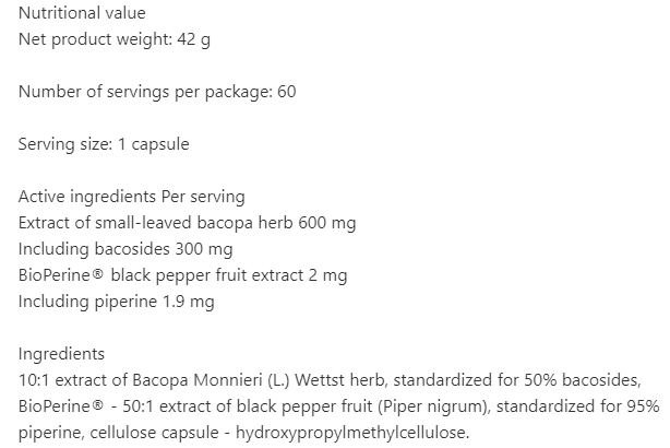 - BioPerine® Black Pepper Fruit Extract (2 mg per capsule): To ensure maximum benefit from the Bacopa monnieri, each capsule includes BioPerine®.