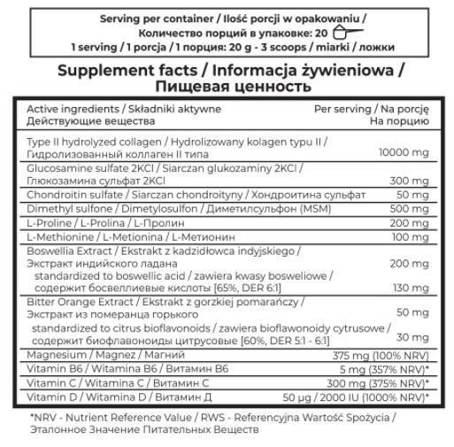 • L-Proline (200 mg per serving): An amino acid critical for protein synthesis, L-Prolin is essential for collagen production. Adequate L-Proline levels support continuous synthesis of new collagen, bolstering joint repair and maintenance.