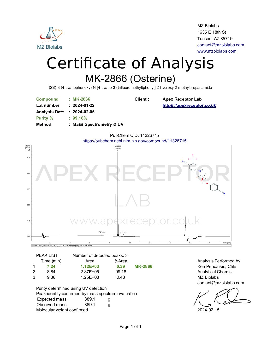 • Lab-Tested Purity: Apex Receptor Lab’s Ostarine is 99% pure and HPLC tested, ensuring you receive a high-quality, pharmaceutical-grade product.