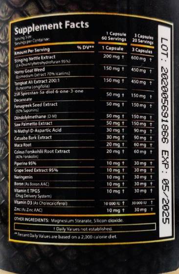 - Extracto de semilla de fenogreco: Standardized to increase free testosterone levels and support healthy androgen levels, contributing to improved muscle mass, strength, and libido.