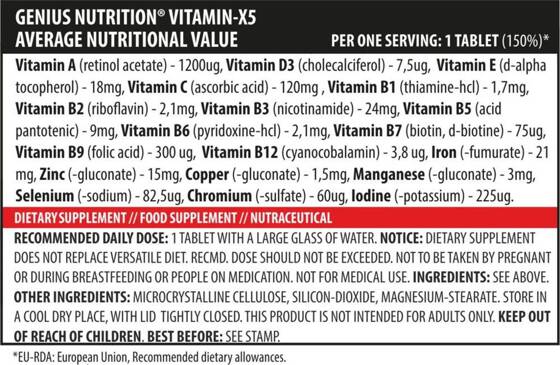 For optimal results, take one (1) tablet of Genius Vitamin X5 daily with water, preferably with a meal. Do not exceed the recommended daily dosage. Consult a healthcare professional before use if you have any medical conditions or are taking other medications.