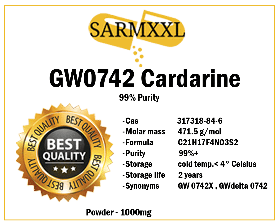 Each container of SARMXXL CARDARINE GW0742 POWDER 1000MG delivers pure, potent compound with a verified purity of 99%+. For chemical specifics, Cardarine GW0742 has a CAS number of 317318-84-6, a molar mass of 471.5 g/mol, and a chemical formula of C21H17F4NO3S2.