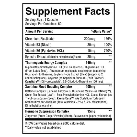 A proprietary blend of potent compounds designed to enhance fat metabolism and energy:- N-Phénéthyldiméthylamine HCl (Eria Jarensis)