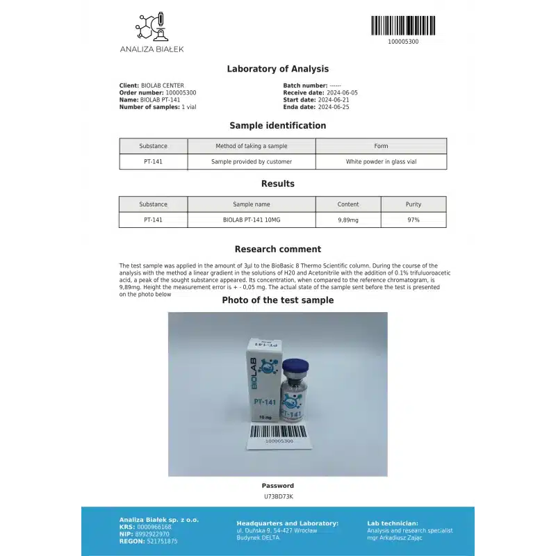 Contents & Formulation: This product is supplied as BioLabs PT-141 Spray 10 mg. While Bremelanotide is typically provided in a lyophilized (freeze-dried) powder form for reconstitution in general research, this specific product is conveniently formulated as a spray, containing the active ingredient Bremelanotide (PT-141, C27H38N4O4).