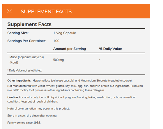 Discover the power of nature with Now Foods Maca 500 mg 250 caps, a premium dietary supplement available to buy online Europe at peakbulk.com. Sourced from the revered maca root (Lepidium meyenii), a native plant of Peru, this supplement is celebrated as a “superfood” for its rich nutritional profile. Each capsule delivers 500 mg of pure maca, packed with essential vitamins, minerals, and amino acids designed to support your overall health and well-being.