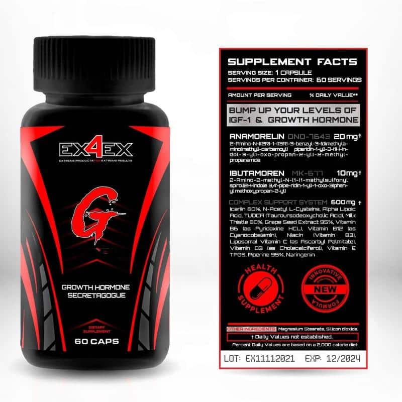 Minden egyes üveg EX4EX G Tropin tartalmaz 60 kapszula, featuring a powerful synergistic blend of two key active ingredients: Anamorelin és Ibutamoren (MK-677). These compounds work in harmony to optimize your hormonal environment for superior physical development.