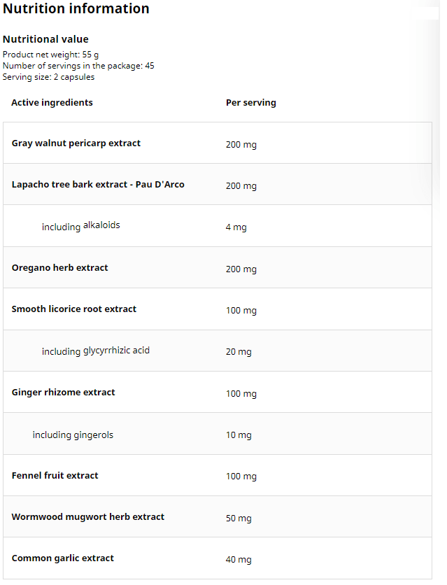 - Gray Walnut Pericarp Extract (Juglans Nigra) – 200 mg: This extract is a rich source of juglone, a compound celebrated for its natural antifungal properties. It plays a crucial role in maintaining healthy gut flora, essential for preventing Candida overgrowth.