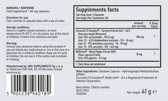 For optimal results, always refer to the dosage instructions on the product label of your UNS Kurkuma + Bioperine 60 kapszula. Consult a healthcare professional before starting any new supplement, especially with pre-existing conditions or other medications.