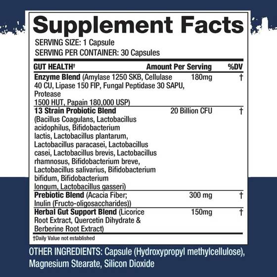 Gaspari Proven GUT 30 caps is a dietary supplement. It contains enzymes, probiotics, prebiotics, and botanical extracts.
