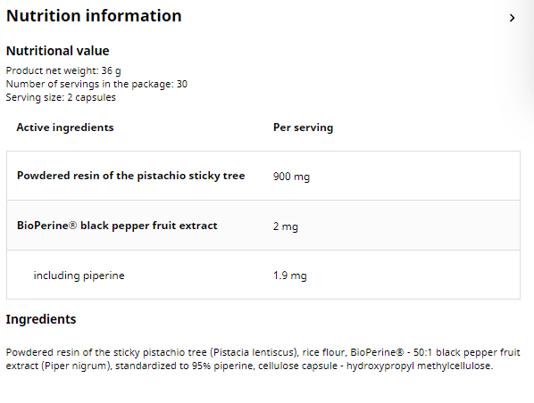 The efficacy of UNS Mastika 60 caps lies in its rich composition, featuring key active ingredients that work synergistically to fortify your digestive tract: