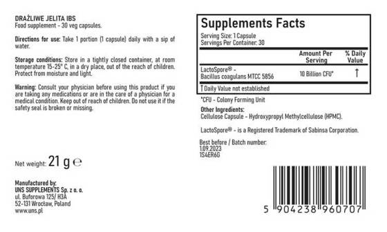 Are you seeking effective relief from digestive discomfort and aiming to optimize your gut health? Look no further than UNS Probiotic 10 Billion 30 caps from Suplementy UNS. Specifically formulated to address symptoms associated with Irritable Bowel Syndrome (IBS) and promote overall digestive wellness, this premium probiotic is your daily ally for a healthier gut. At peakbulk.com, you can easily buy online Europe, ensuring you receive high-quality, lab-tested supplements delivered right to your door.