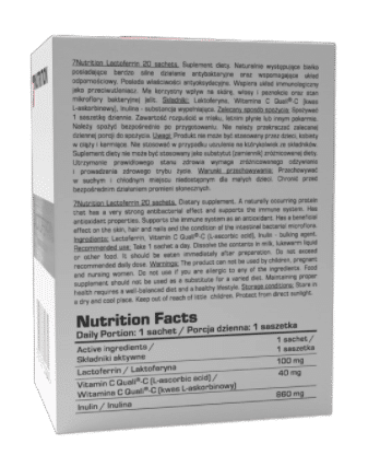 Discover the comprehensive immune support of 7Nutrition Lactoferrin Immune Health. This innovative dietary supplement combines the potent benefits of lactoferrin, the renowned antioxidant Vitamin C (Quali-C), and the gut-supporting prebiotic inulin. Conveniently packaged in individual sachets, it’s designed to seamlessly integrate into your busy lifestyle, providing robust protection against bacterial and viral infections while promoting overall well-being.