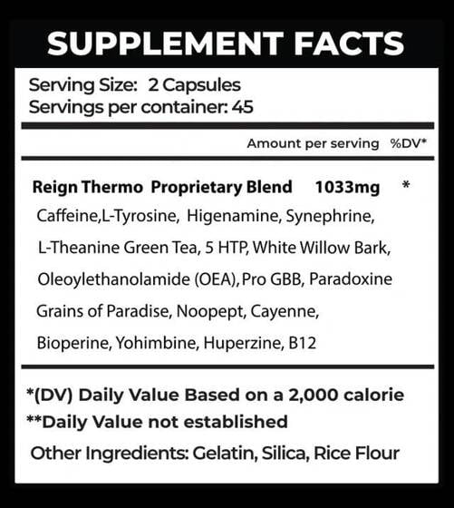 The effectiveness of Grind Reign lies in its proprietary blend, designed to target multiple pathways for comprehensive fat reduction and performance enhancement. Each serving (2 capsules) delivers 1033 mg of the Reign Thermo Proprietary Blend, featuring key compounds: